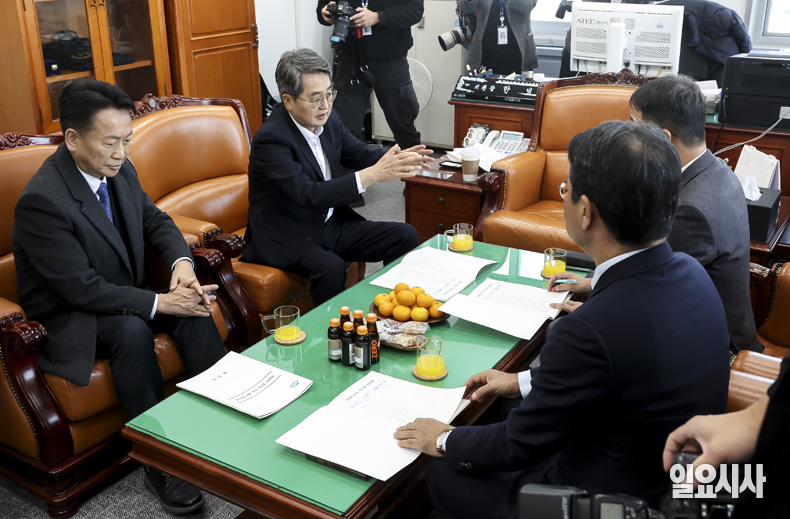 김동연 경기도지사가 17일 오후 서울 여의도 국회에서 한병도 예산결산특별위원장을 예방해 대화를 나누고 있다. 이날 김 지사는 한병도 예결위원장을 만나 2026년도 경기도 주요 국비사업 건의서를 제출했다.