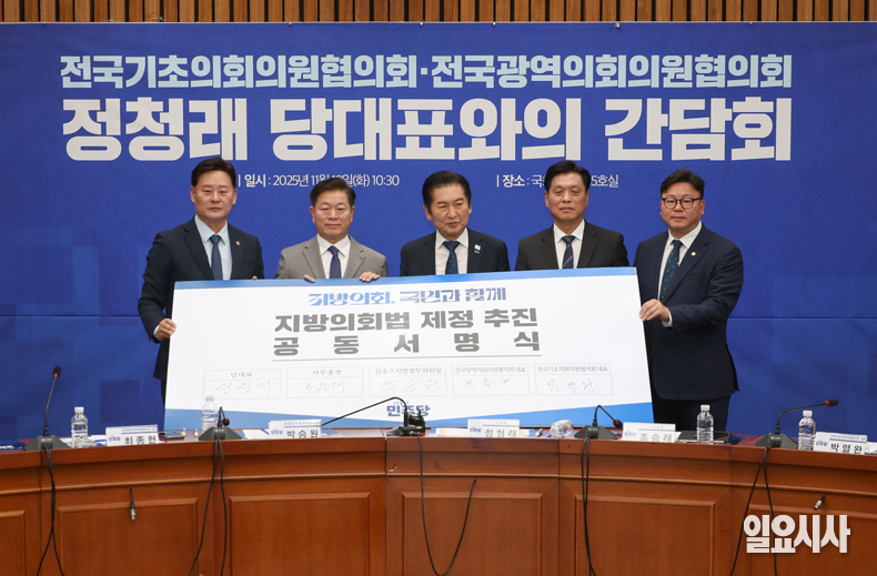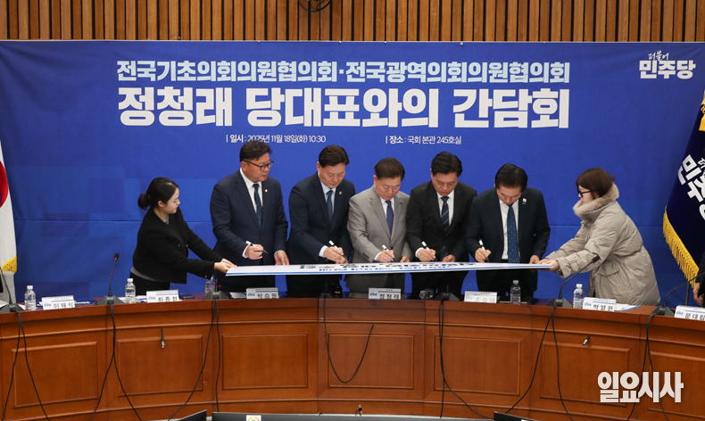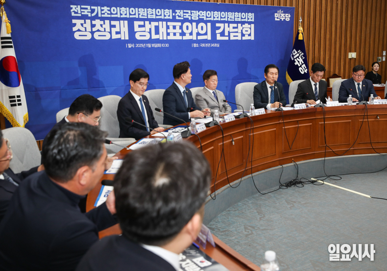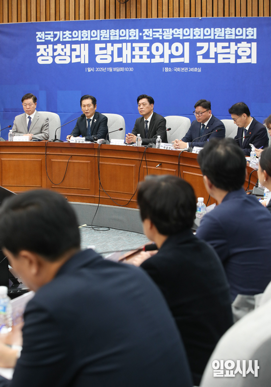 더불어민주당 정청래 대표와 참석자들이 18일 오전 서울 여의도 국회에서 열린 ‘민주당 전국 기초·광역의회의원협의회 간담회’에서 사진 촬영을 하고 있다.