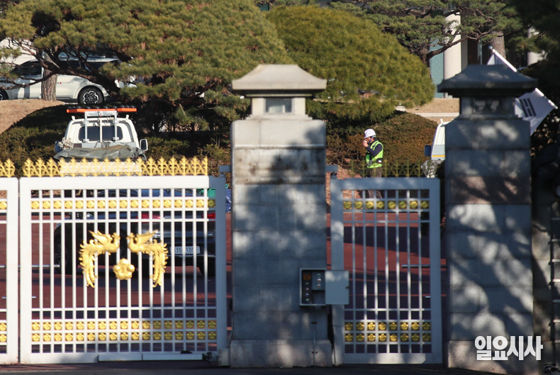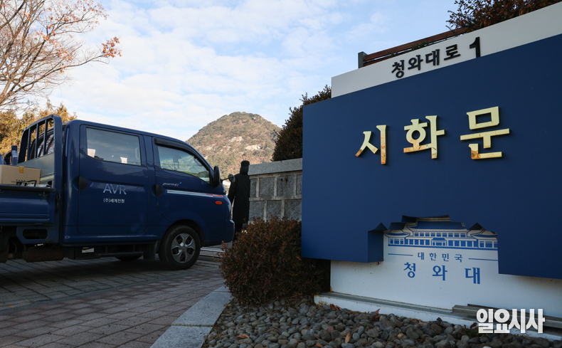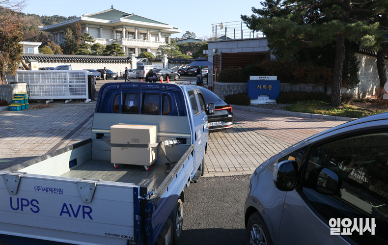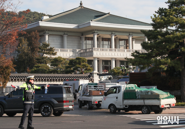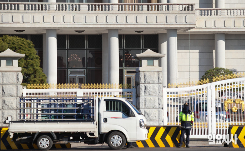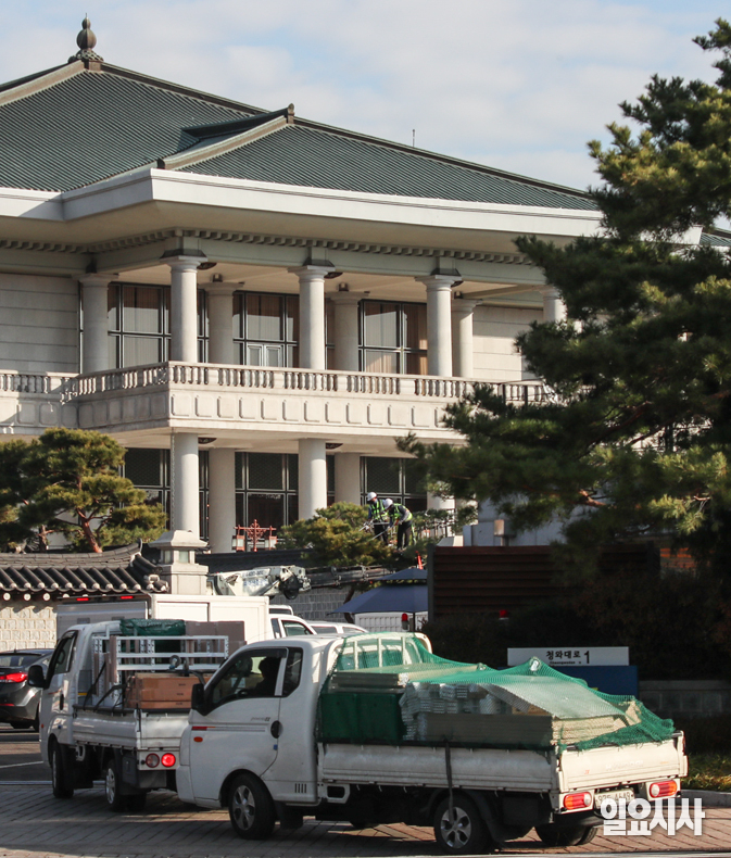 대통령실 각 부서의 업무 시설 이전 작업이 본격적으로 시작된 9일 오전 서울 종로구 청와대 시화문으로 작업 차량이 들어서고 있다.