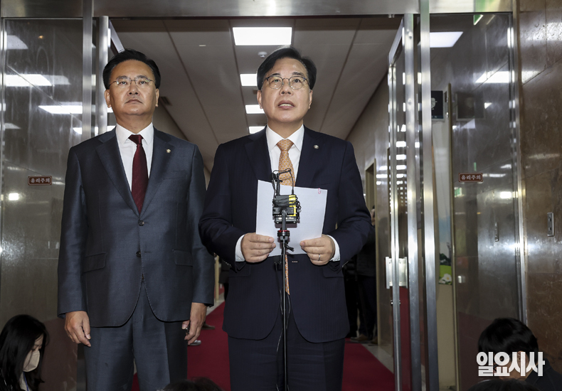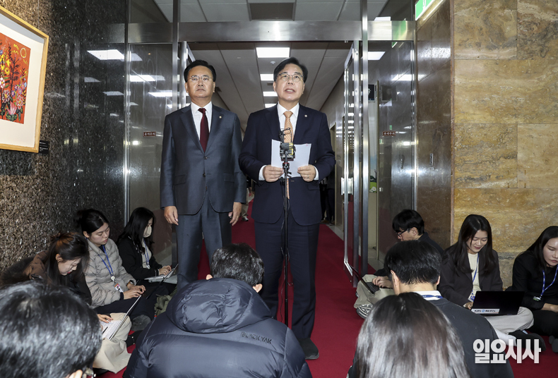국민의힘 송언석 원내대표가 9일 오전 서울 여의도 국회 의장실 앞에서 '국회의장 및 양당 원내대표 회동 전 입장발표 기자회견'을 하고 있다.
