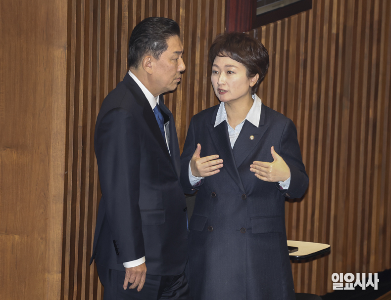 더불어민주당 김병기 원내대표가 9일 서울 여의도 국회에서 열린 제429회국회(정기회) 제16차 본회의에서 이언주 최고위원과 대화를 나누고 있다.