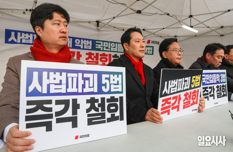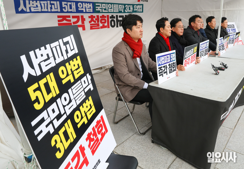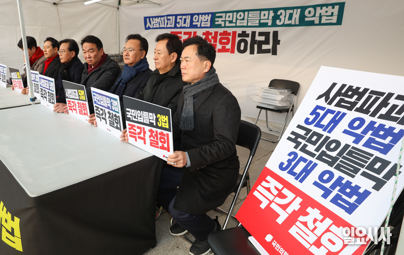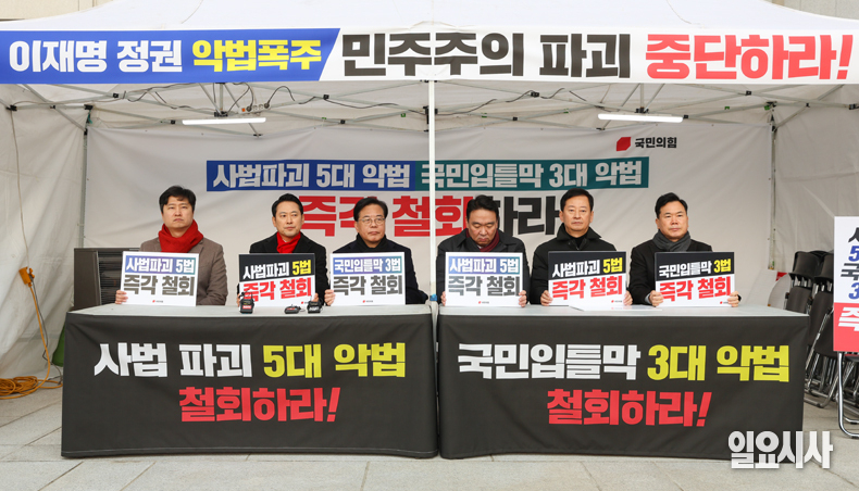 국민의힘이 10일 오전 서울 여의도 국회 본청 앞에서 더불어민주당이 추진하는 쟁점 법안을 저지하기 위한 ‘8대 악법 저지를 위한 릴레이 천막농성’을 진행하고 있다.