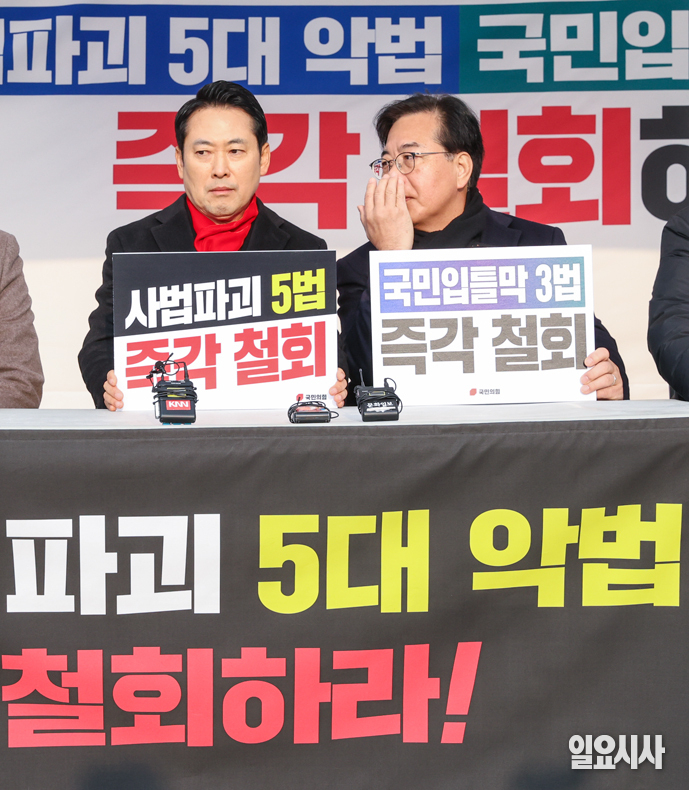 국민의힘은 하루 4개 조로 나눠 조당 4~5명이 번갈아 농성을 진행한다. 종료 시점은 정하지 않고 ‘8대 악법’을 저지할 때까지 이어간다고 밝혔다.
