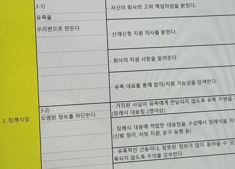 매뉴얼에는 일명 ‘미션’이 존재했다. 사건 발생, 병원 대응, 장례식장, 고용노동부 대응, 국회 대응, 경찰 대응 등 일곱 단계로 구성됐다. 특히 장례식장 단계에선 “유족을 우리 편으로 만든다” “오염된 정보를 차단한다” 등 두 가지가 미션으로 언급됐다.