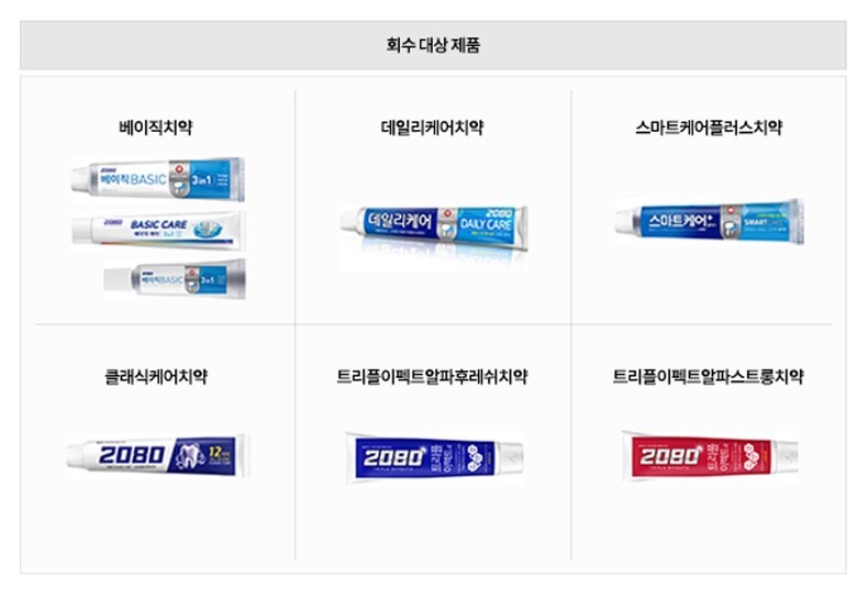 이번 회수 대상 제품은 ▲2080 베이직 치약 ▲2080 데일리케어 치약 ▲2080 스마트케어플러스 치약 ▲2080 클래식케어 치약 ▲2080 트리플이펙트 알파후레쉬 치약 ▲2080 트리플이펙트 알파스트롱 치약 6종이다.
