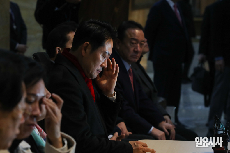 국민의힘 장동혁 대표가 15일 오후 서울 여의도 국회 로텐더홀에서 ‘통일교·공천헌금’ 쌍특검법 수용을 촉구하며 단식하는 자리에서 생각에 잠겨있다.