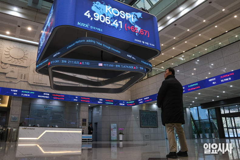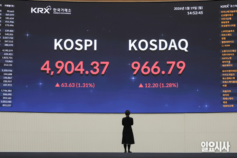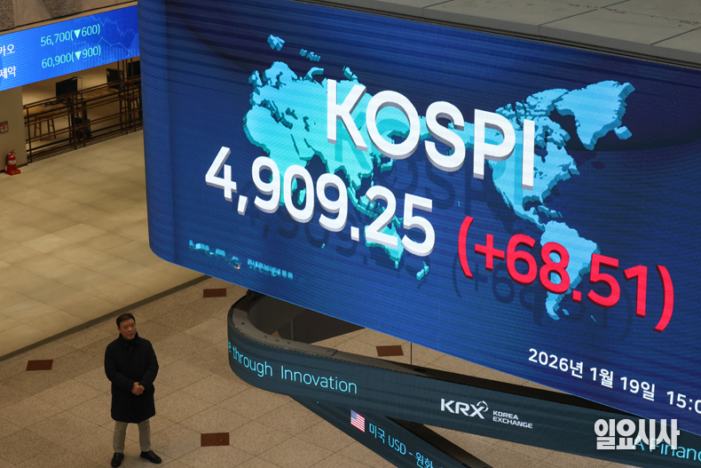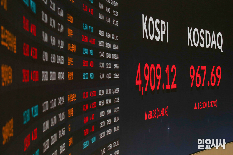 코스피가 장중 4900선을 넘어선 가운데 19일 오후 서울 여의도 한국거래소 홍보관 전광판에 코스피 종가 4908.04 포인트를 나타내고 있다.