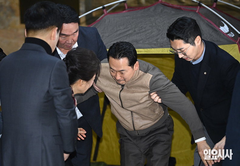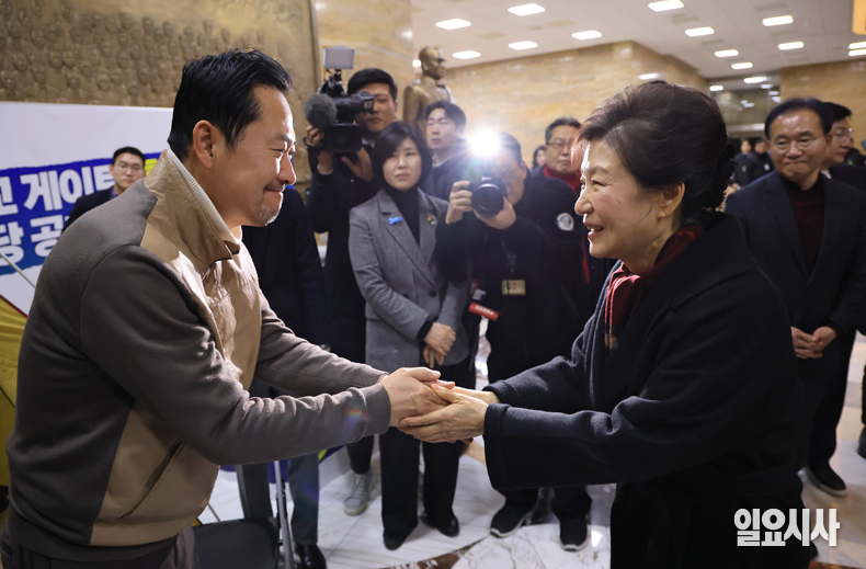 박근혜 전 대통령이 22일 오전 서울 여의도 국회에서 통일교·민주당 공천 뇌물 특검 등 쌍특검을 요구하며 8일째 단식농성을 하는 국민의힘 장동혁 대표를 만나 대화를 나누고 있다.