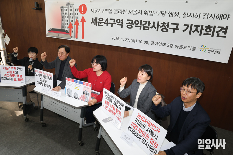 참여연대 관계자들이 27일 오전 서울 종로구 참여연대에서 열린 ‘세운재정비촉진지구 4구역 관련 서울시의 위법·부당한 행정에 대한 공익감사청구 기자회견’에서 구호를 외치고 있다.