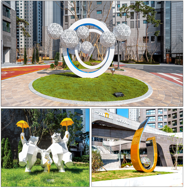 ‘반월역 두산위브 더센트럴’에는 김인태 작가의 작품이 배치되어 단지 곳곳에 조형적 리듬감을 더하고 있으며, ‘두산위브 더제니스 센트럴 여의’에는 장세일 작가의 조형물이 어우러져 주거 공간에 세련된 분위기를 형성하고 있다. 또 ‘김해율하 더스카이시티 제니스&프라우’에는 이정근 작가의 작품을 문주에 배치해 단지에 들어서는 순간부터 상징성과 품격이 자연스럽게 전달되도록 했다.