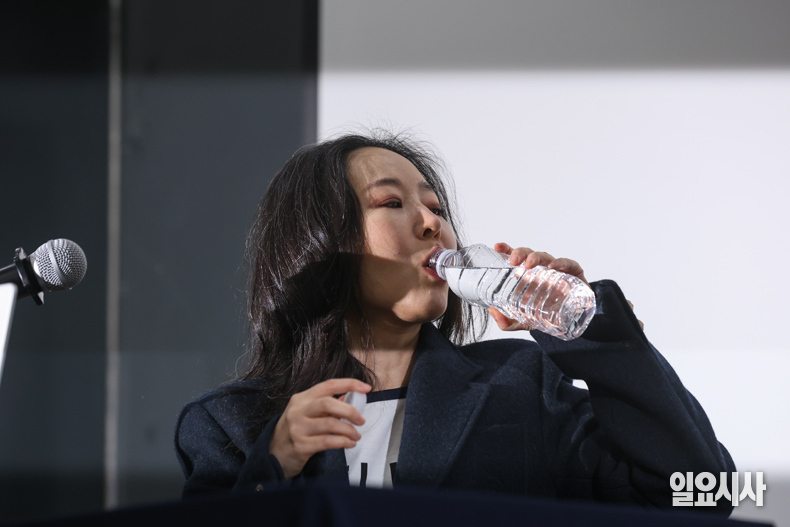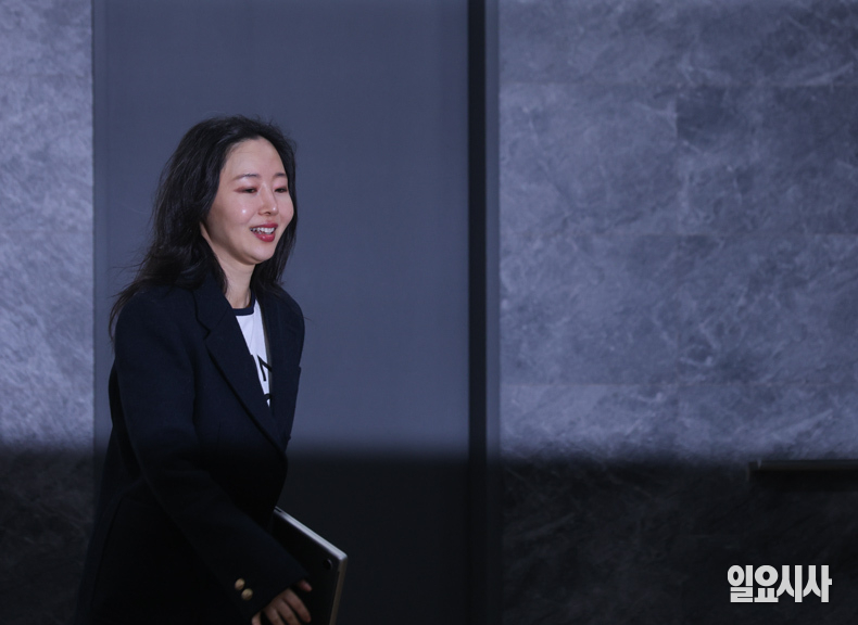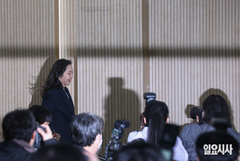 민희진 오케이레코즈 대표(전 어도어 대표)가 25일 오후 서울 종로구 교원챌린지홀에서 열린 1심 소송 결과와 향후 계획 발표 기자회견에 밝은 표정으로 참석하고 있다.