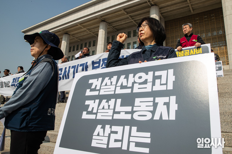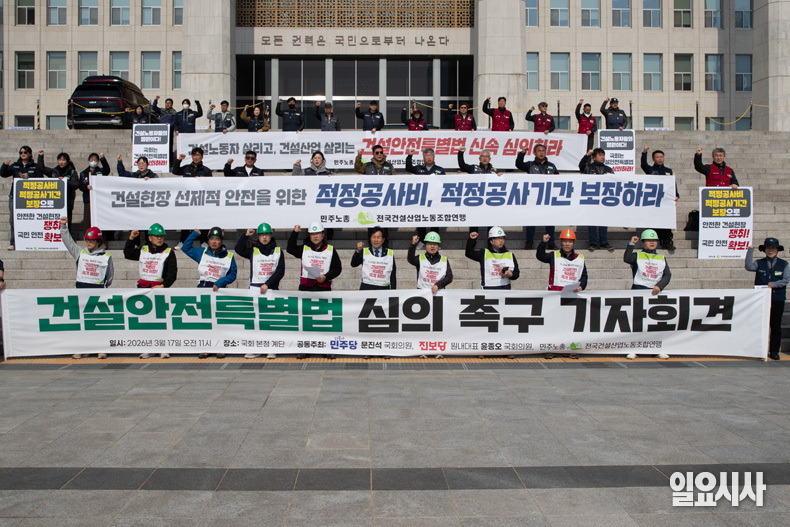 17일 오전 서울 여의도 국회 본청 앞에서 열린 ‘건설안전특별법 심의 촉구 기자회견’에 참가자들이 구호를 외치고 있다.
