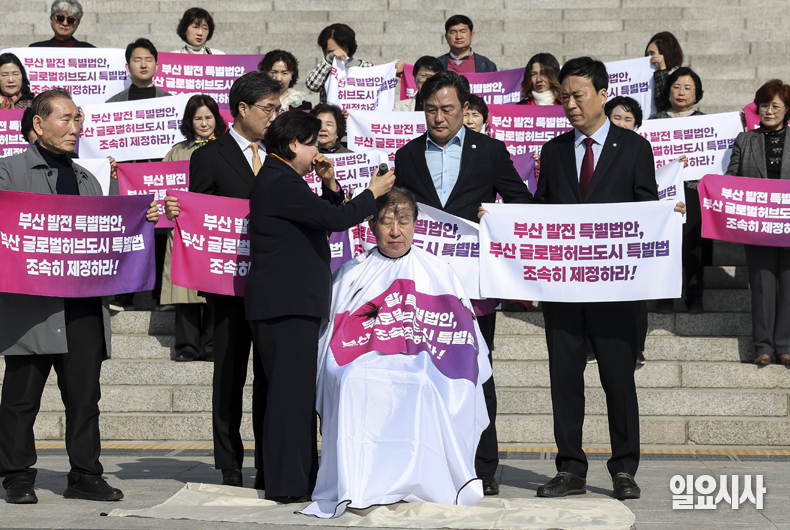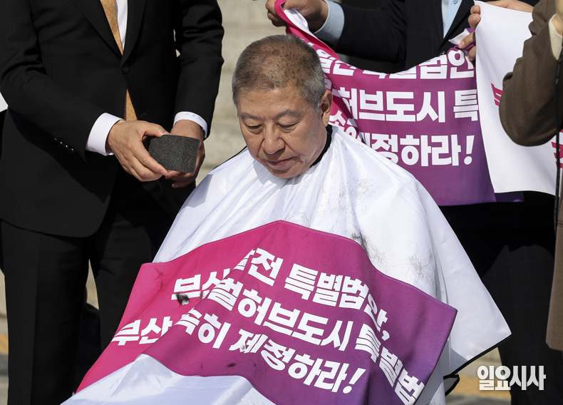 박형준 부산시장이 23일 서울 여의도 국회 본청 앞 계단에서 열린 '부산 글로벌허브도시 특별법 제정 촉구 기자회견'을 마친 뒤 삭발하고 있다.