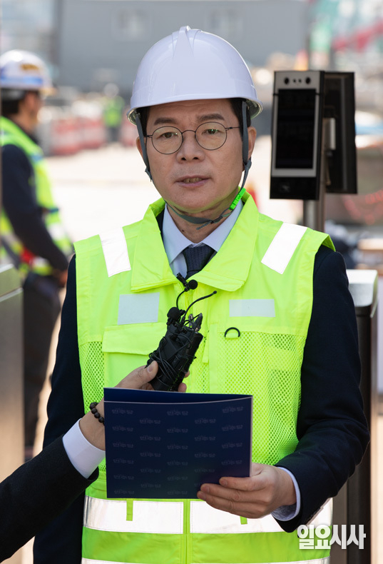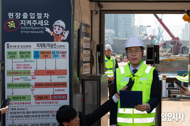 더불어민주당 정원오 서울시장 예비후보가 23일 오전 서울 강남구 영동대로 복합개발 공사 현장에서 안전 공약 발표를 하고 있다.