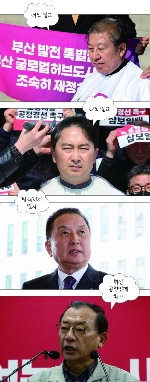 국민의힘이 앞다투어 삭발을 단행하는 웃지 못할 촌극이 벌어지고 있다. 지방선거를 앞두고 당에 불만을 가진 이들이 항의 차원으로 삭발이라는 최후의 수단을 선택한 것. 박형준 부산시장은 ‘부산 글로벌허브도시특별법’ 처리를 촉구하며 국회 앞에서 머리를 밀었다. 각각 포항시장과 충북지사에서 컷오프된 국민의힘 김병욱 전 의원·김영환 도지사는 공정한 경선을 촉구하며 삭발을 했다. 결의를 보여주기 위한 행동이라지만 최근 너도나도 동참하는 바람에 오히려 진정성이 떨어진다는 지적만 제기됐다.