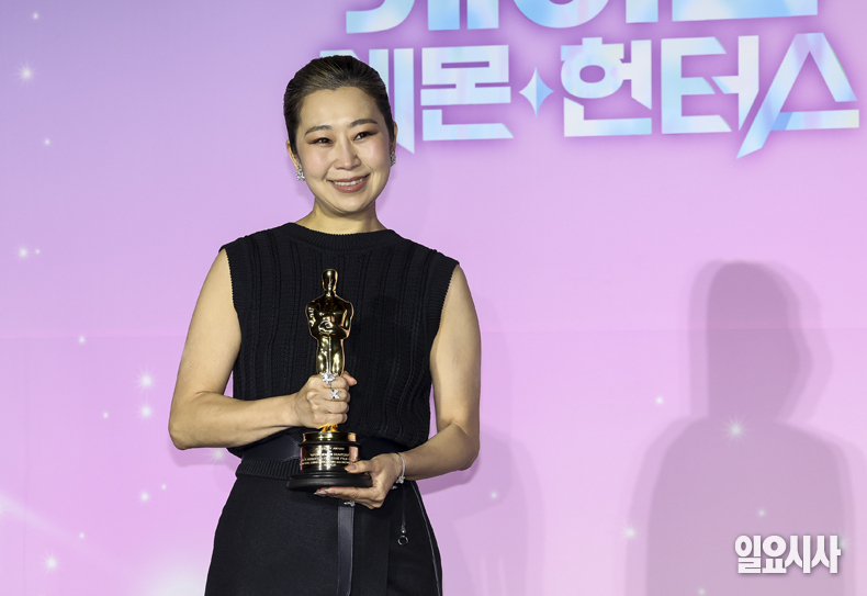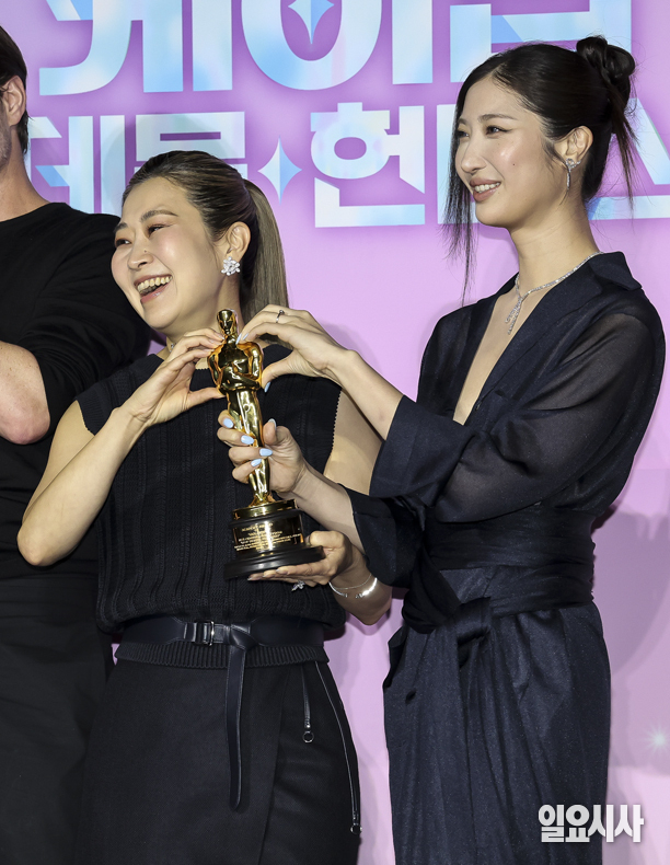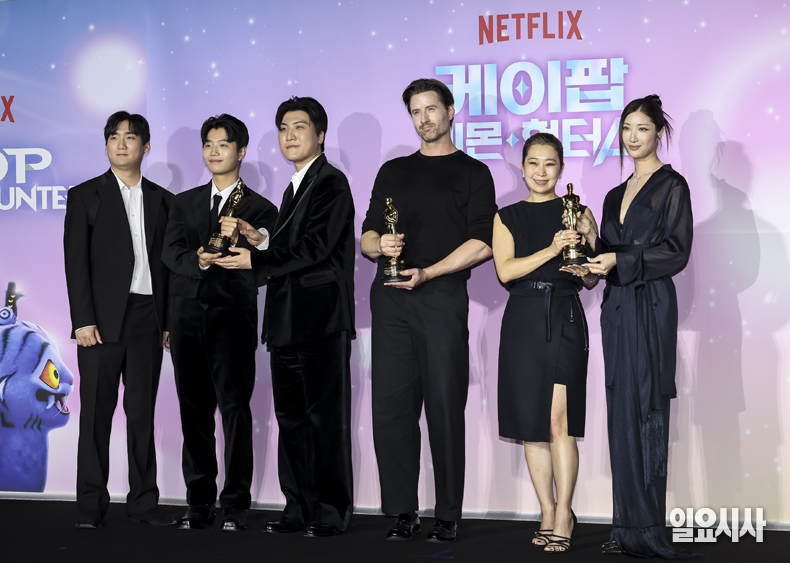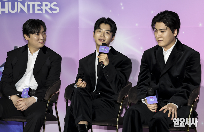 이날 기자간담회에는 더블랙레이블 프로듀서 IDO(남희동, 이유한, 곽중규), EJAE(이재), 크리스 애플한스 감독, 매기 강 감독이 자리했다.