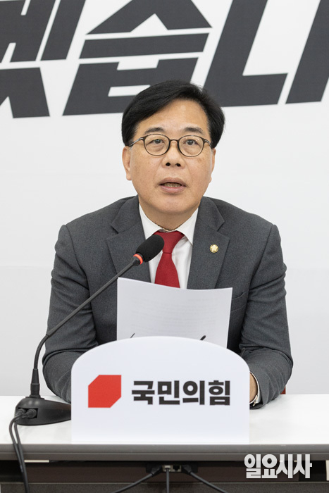 국민의힘 송언석 원내대표가 15일 오후 서울 여의도 국회에서 기자간담회를 갖고 있다.