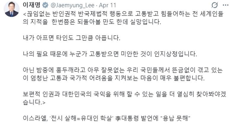 이스라엘의 공개 규탄에 이 대통령은 지난 11일 “끊임없는 반인권적 반국제법적 행동으로 고통받고 힘들어하는 전 세계인들의 지적을 한 번쯤은 되돌아볼 만도 한데 실망”이라며 “내가 아프면 타인도 그만큼 아프다. 나의 필요 때문에 누군가 고통받으면 미안한 것이 인지상정”이라고 훈수했다.