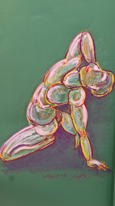 그의 작품에서 중요한 것은 ‘정확성’이 아니다. ‘남겨진 흔적’이다. 검은 바탕 위에서 번지는 선, 붉은 면 위에서 흔들리는 윤곽, 초록의 배경 속에서 뒤엉키는 육체. 그것들은 완성을 향해 닫히지 않는다. 덜 닫혀 있기 때문에, 더 많이 드러낸다. 몸은 흐릿하지만 감정은 선명하다. 인체는 재현이 아니라, 내면이 흘러나오는 통로다.