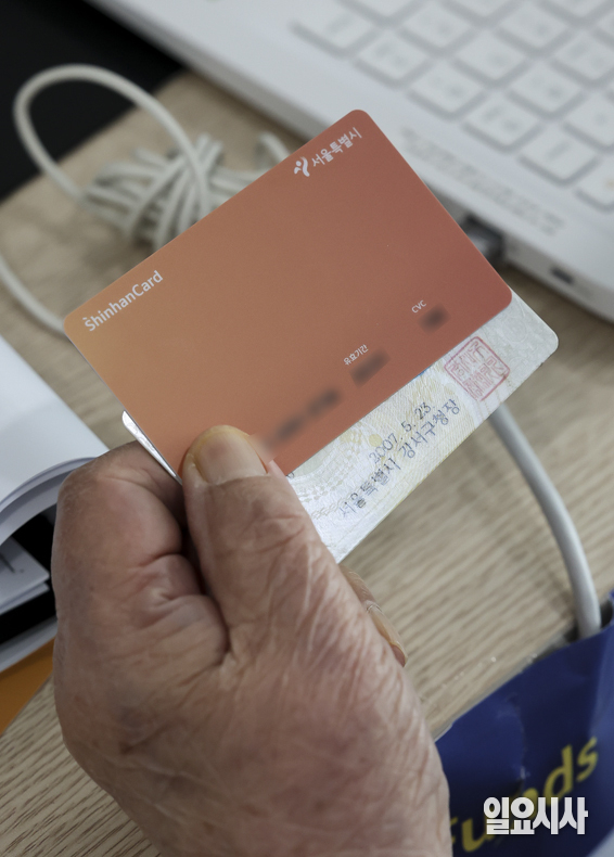 고유가 피해지원금 1차 지급 시작일인 27일 오후 서울 강서구 화곡4동 주민센터에서 지원금 신청을 마친 시민이 선불카드를 수령하고 있다.