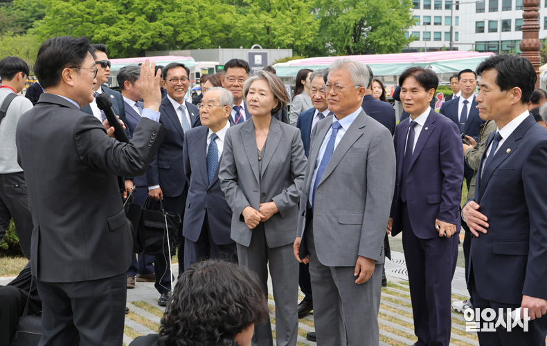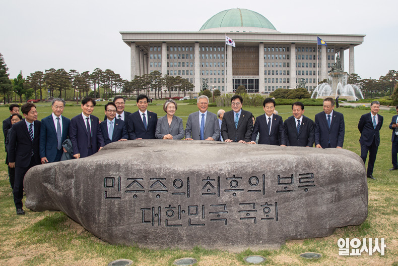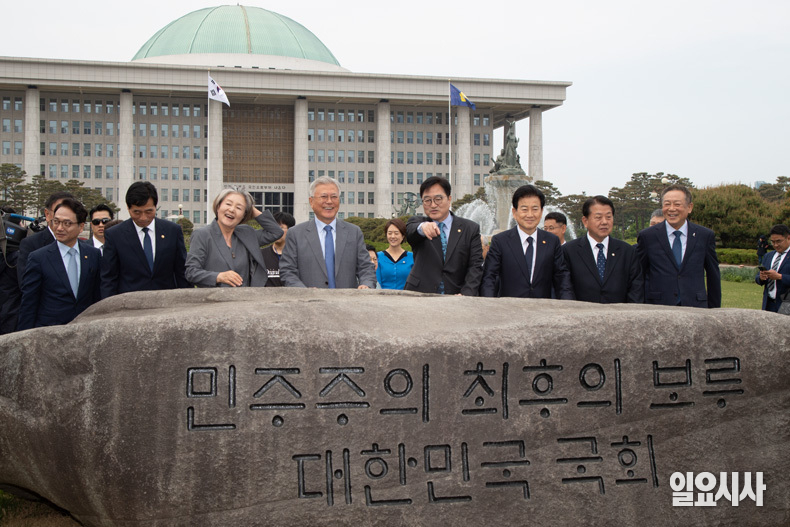 문재인 전 대통령과 김정숙 여사가 ‘4.27 판문점선언 8주년 기념식’ 참석차 27일 오후 서울 여의도 국회를 방문해 ‘민주주의 최후의 보루 대한민국 국회’ 문구가 새겨진 상징석 앞에서 우원식 국회의장과 정동영 통일부 장관, 김민기 국회사무총장, 더불어민주당 의원들과 기념촬영을 하고 있다.
