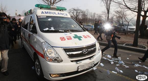 설 특별사면 대상자인 천신일 세중나모여행 회장이 31일 오전 경기도 의왕시 서울구치소에서 구급차를 타고 출소하는 도중 한 시민이 던진 두부와 돈을 맞고 나서고 있다.