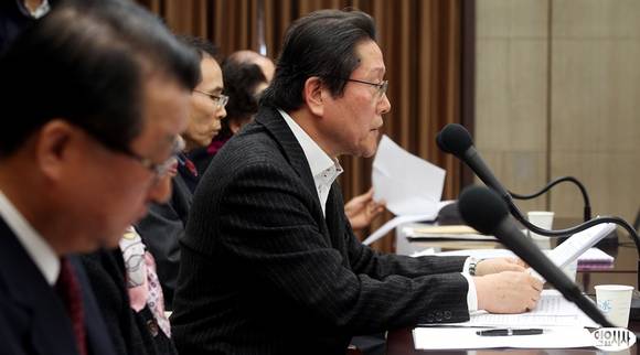 구룡마을 토지주 협의체가 3일 오전 서울 중구 프레스센터에서 열린 기자회견에서 구룡마을 개발에 관한 입장을 표명하고 있다. 이들은 구룡마을에 대한 환지(재개발 지역 세입자에게 주어지는 토지권) 방식 개발을 주장하며 이를 반대한 강남구청장이 허위사실을 유포한다고 주장, 구청장과의 대화를 요구했다.
