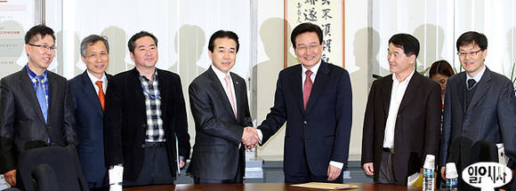 3일 오후, 서울 여의도 국회에서 열린 여야 '6인 협의체' 첫 실무회의서 변재일 민주통합당 정책위의장(사진 오른쪽에서 세 번째)과 나성린 새누리당 정책위의장(사진 왼쪽에서 네 번째)이 악수를 나누고 있다.
