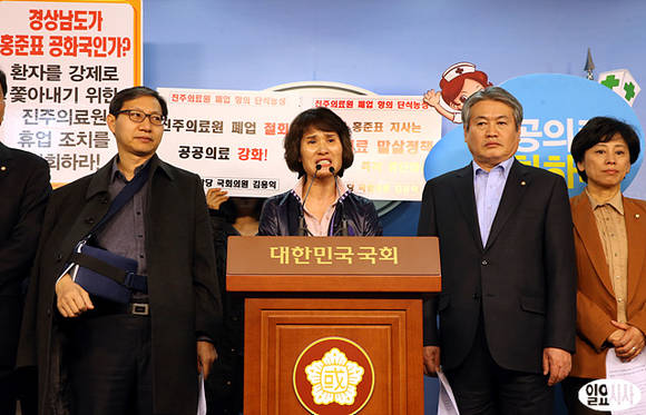4일 오후 서울 여의도 국회 정론관에서 국회 보건복지위 민주통합당 의원들과 진주의료원 노조원들이 참석한 가운데 의료원 휴·폐업 철회와 정상화를 요구하는 기자회견을 열고 있다.