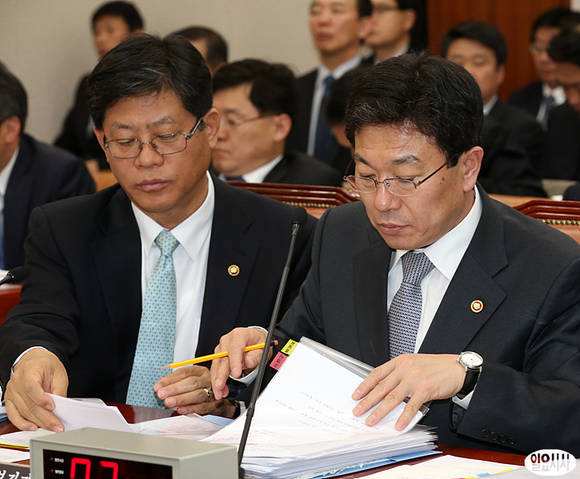 윤상직 산업통상자원부 장관이 8일, 서울 여의도 국회에서 열린 산업통상자원위원회 전체회의에서 질의에 답변 도중 자료들을 확인하고 있다.