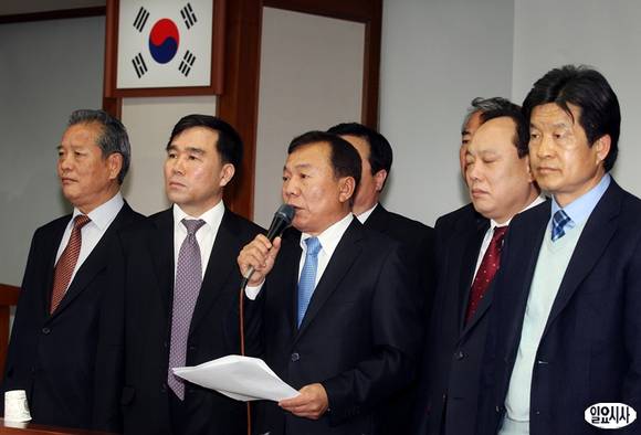 한재권 개성공단기업협회장과 대표단이 9일 오전 서울 여의도 중소기업중앙회에서 열린 북한 당국의 개성공단 통행제한 조치에 따른 조업중단 사태와 관련한 긴급 기자회견에 참석해 발언을 하고 있다.