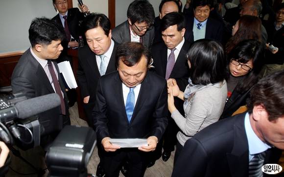 한재권 개성공단기업협회장과 대표단이 9일 오전 서울 여의도 중소기업중앙회에서 열린 북한 당국의 개성공단 통행제한 조치에 따른 조업중단 사태와 관련한 긴급 기자회견을 마친 뒤 퇴장하고 있다.