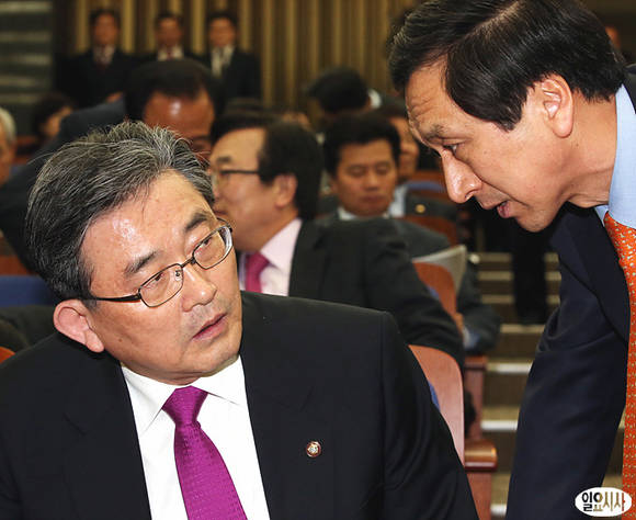 이한구 새누리당 원내대표가 11일 오후 서울 여의도 국회 246호 회의실에서 열린 새누리당 정책의원총회에서 김기현 원내수석부대표와 대화를 나누고 있다.