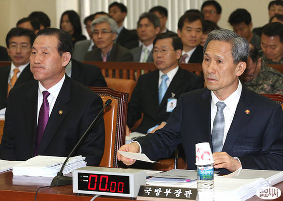 김관진 국방부장관이 15일 오전, 서울 여의도 국회에서 열린 국방위원회 전체회의에 출석해 의원들의 질의에 답변 도중 쪽지 자료를 건네 받아 손에 들고 있다.