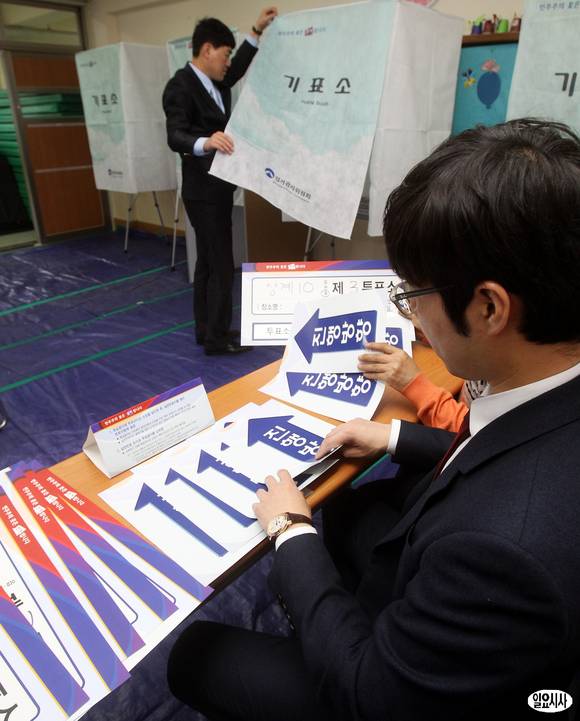 4·24 재보궐 선거를 하루 앞둔 23일 서울 노원구 상곡초등학교에서 선거관리위원회 직원들이 투표소를 설치하고 있다.