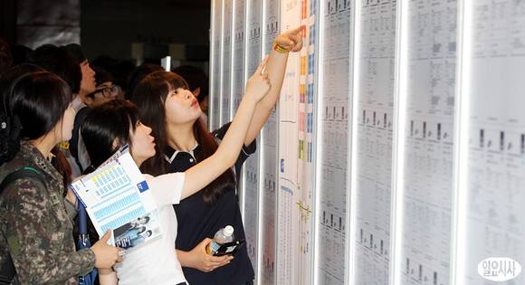 28일 오전 서울 강남구 삼성동 코엑스에서 열린 '삼성 협력사 채용 한마당'을 찾은 학생들과 구직자들이 채용공고 게시판을 살펴보고 있다.