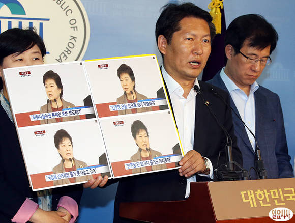 정청래 의원 등 민주당 국정원 불법선거개입사건 진상조사특위와 법제사법위원회 소속 의원들이 3일 서울 여의도 국회 정론관에서 기자회견을 하고 있다.