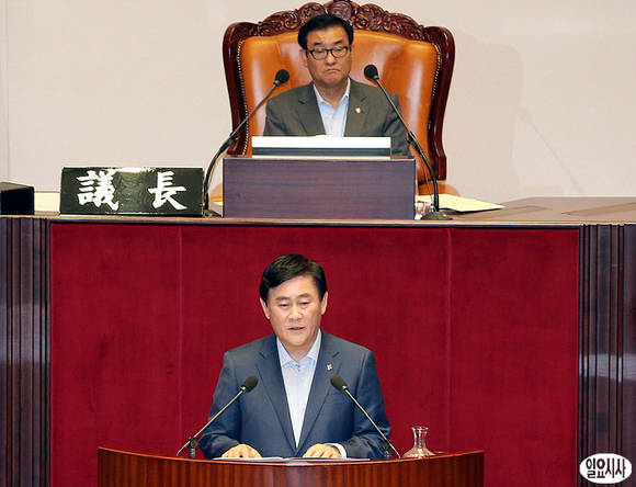 최경환 새누리당 원내대표(사진 아래)가 4일 오전 서울 여의도 국회 본회의장에서 교섭단체 대표연설을 하고 있고 의장석에 강창희 의장이 배석해 있다.