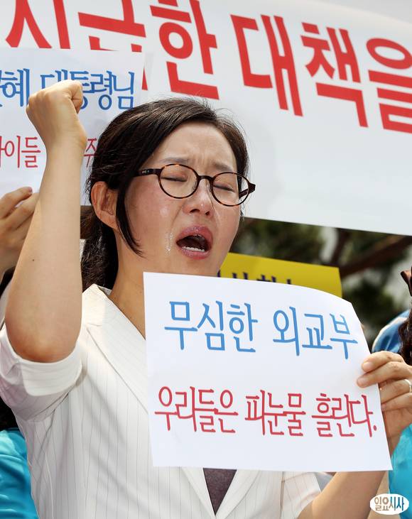 5일 오후 서울 세종로 외교부 정문 앞에서 자유와 인권을 위한 탈북자연대 주최로 열린 라오스 탈북청소년 9명 강제 북송 항의집회에서 참석자들이 구호를 외치고 있다.
