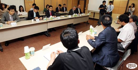 5일 오후 서울 종로구 태화빌딩 회의실에서 열린 남양유업 본사와 전국대리점협의회의 1차 협상에서 안희대 전국대리점협의회장이 모두발언을 하고 있다. 전국대리점협의회는 전국의 960개 현직 남양유업 대리점들로 이뤄진 단체로, 퇴직 점주 10여명의 모임인 피해자협의회와는 다른 단체다.