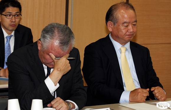 5일 오후 서울 종로구 태화빌딩 회의실에서 열린 남양유업 본사와 전국대리점협의회의 1차 협상에 참석한 남양유업 김웅 대표이사(오른쪽)와 곽주영 영업총괄본부장이 굳은 표정을 짓고 있다. 전국대리점협의회는 전국의 960개 현직 남양유업 대리점들로 이뤄진 단체로, 퇴직 점주 10여명의 모임인 피해자협의회와는 다른 단체다.
