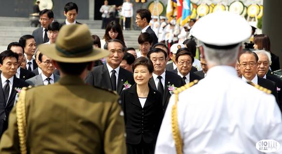박근혜 대통령이 6일 오전 서울 동작동 국립현충원에서 열린 제58회 현충일 추념식에서 참석자들과 현충탑을 참배하고 있다.