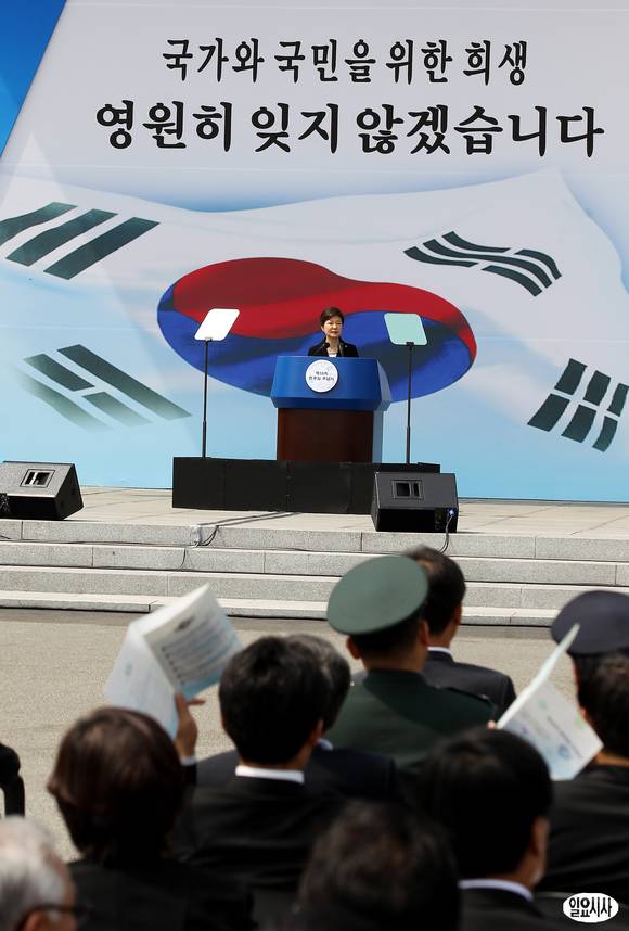 박근혜 대통령이 6일 오전 서울 동작동 국립현충원에서 열린 제58회 현충일 추념식에서 추념사를 하고 있다.