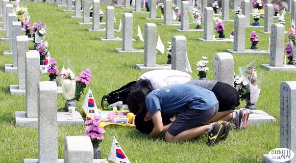 현충일인 6일 서울 동작동 국립서울현충원을 찾은 가족들이 참배를 하고 있다.