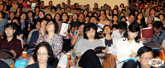 6일 오후 서울 잠실학생체육관에서 이투스청솔 교육평가연구소 주최로 열린 '6월 모의평가 분석 및 입시전략 설명회'에서 학생들과 학부모들이 강사의 설명을 경청하고 있다.