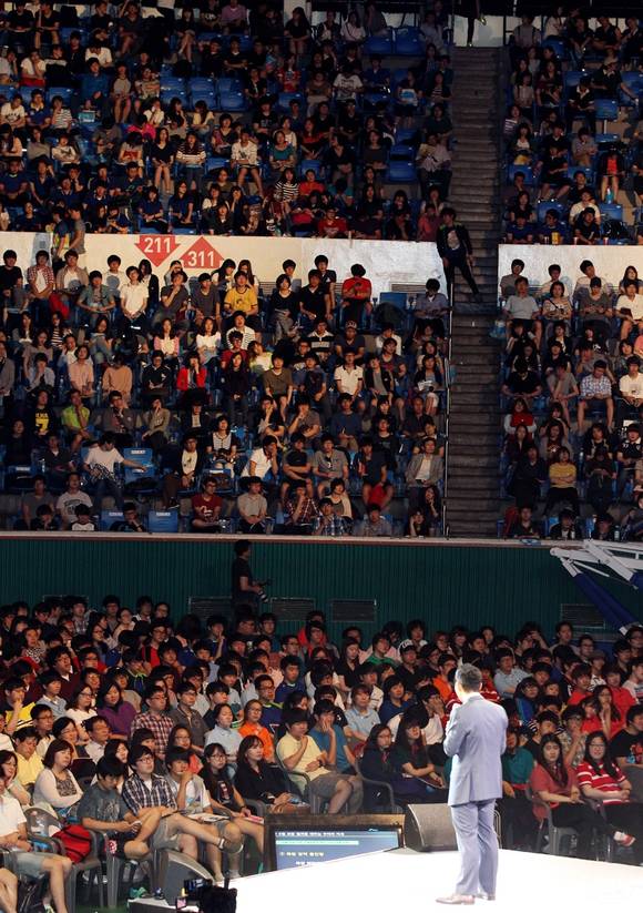 6일 오후 서울 잠실학생체육관에서 이투스청솔 교육평가연구소 주최로 열린 '6월 모의평가 분석 및 입시전략 설명회'에서 학생들과 학부모들이 강사의 설명을 경청하고 있다.