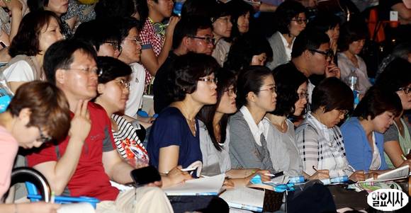 6일 오후 서울 잠실학생체육관에서 이투스청솔 교육평가연구소 주최로 열린 '6월 모의평가 분석 및 입시전략 설명회'에서 학생들과 학부모들이 강사의 설명을 경청하고 있다.
