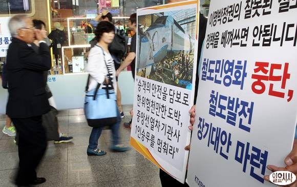 7일 오전 서울역에서 열린 '대통령의 철도발전 공약이행 촉구와 철도민영화 저지를 위한 100만인 서명운동 선포식'에서 전국철도노동조합, 민영화반대 공동행동 등 회원들이 피켓을 들고 있다.