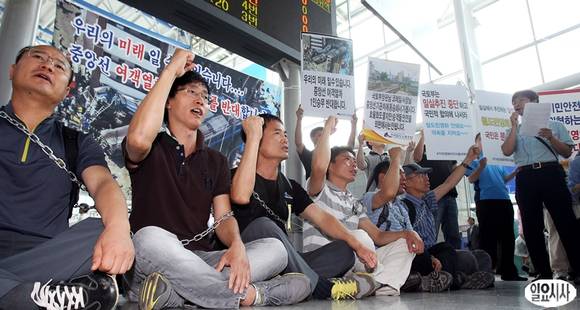 7일 오전 서울역 대합실에서 현직 기관사들이 온몸에 쇠사슬을 두른 채 '중앙선 여객열차 1인승무 반대'를 외치며 농성을 벌이고 있다. 기관사들은 "경부선과 달리 중앙선은 신호시스템이 낙후되어 열차운행 중 안전확보에 관한 모든 사항을 기관사에게 전적으로 의존하고 있다"며 1인승무 중단을 요구했다.
