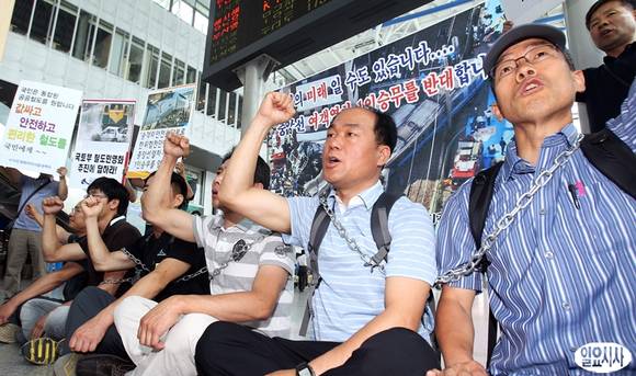 7일 오전 서울역 대합실에서 현직 기관사들이 온몸에 쇠사슬을 두른 채 '중앙선 여객열차 1인승무 반대'를 외치며 농성을 벌이고 있다. 기관사들은 "경부선과 달리 중앙선은 신호시스템이 낙후되어 열차운행 중 안전확보에 관한 모든 사항을 기관사에게 전적으로 의존하고 있다"며 1인승무 중단을 요구했다.